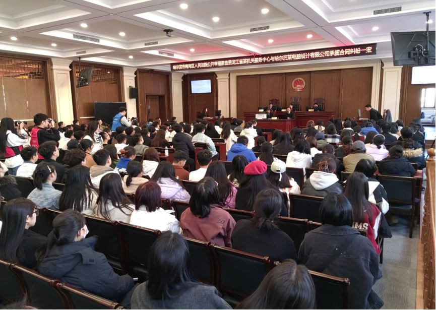“法庭进校园”活动之南岗法院庭审活动庄严开锤。近百名师生在av麻豆