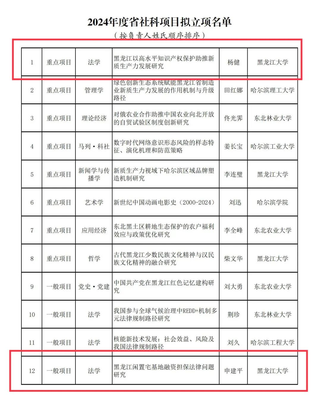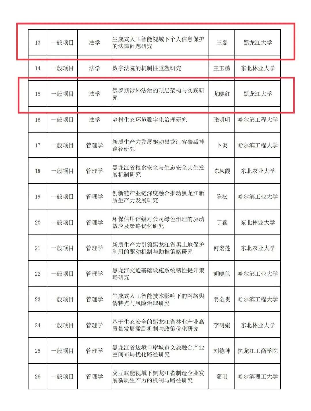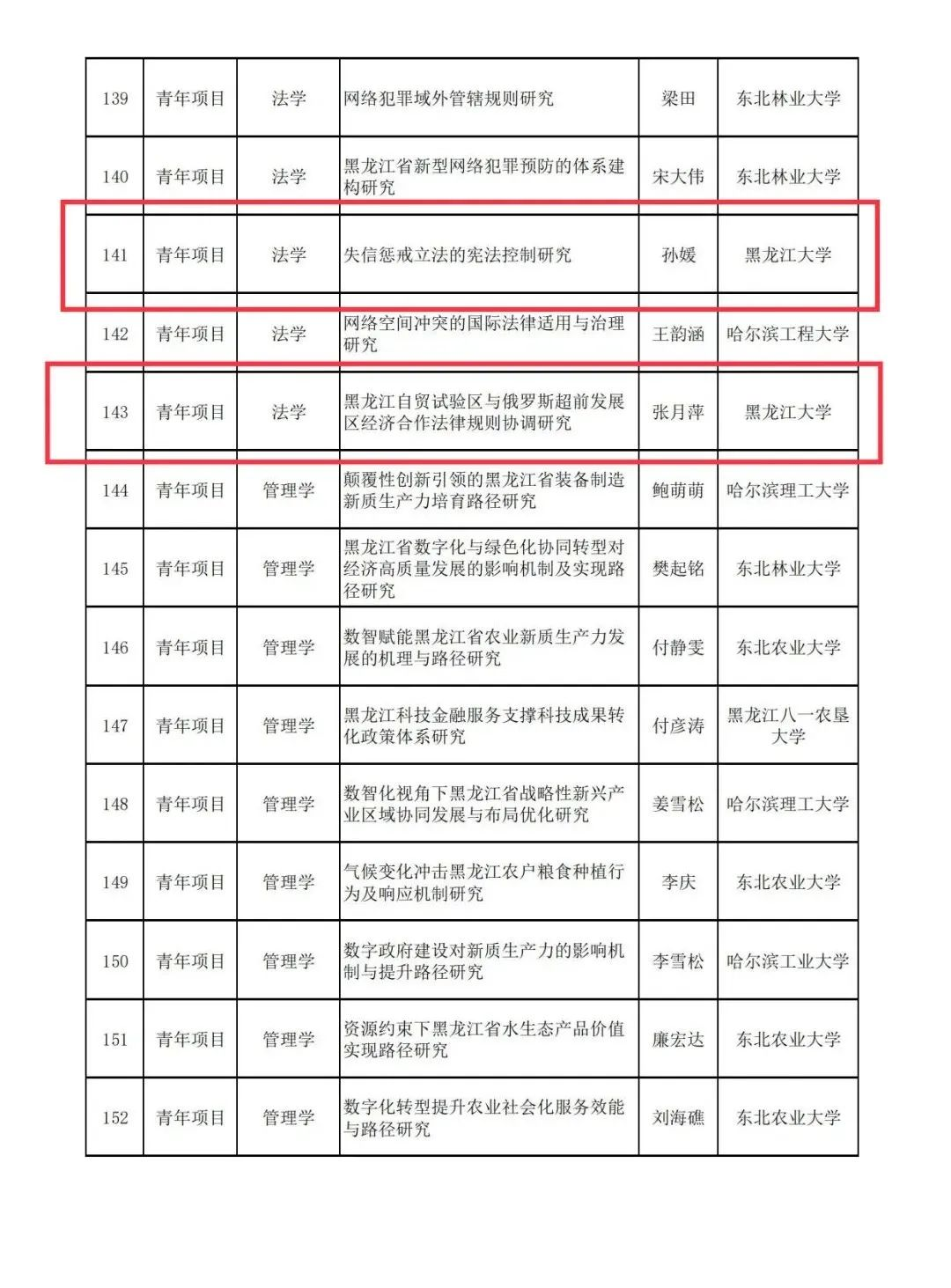 11月23日,黑龙江省哲学社会科学工作办公室将2024年度省社科研究规划项目拟立项名单予以公示。其中,av麻豆 获批重点项目1项,一般项目3项,青年项目2项。