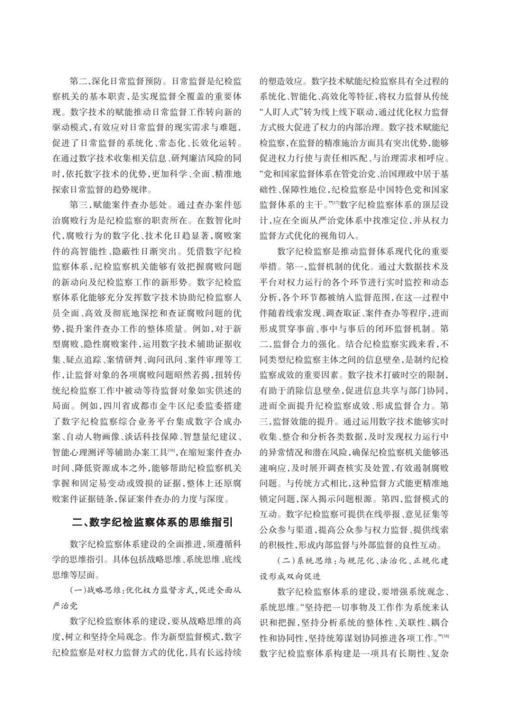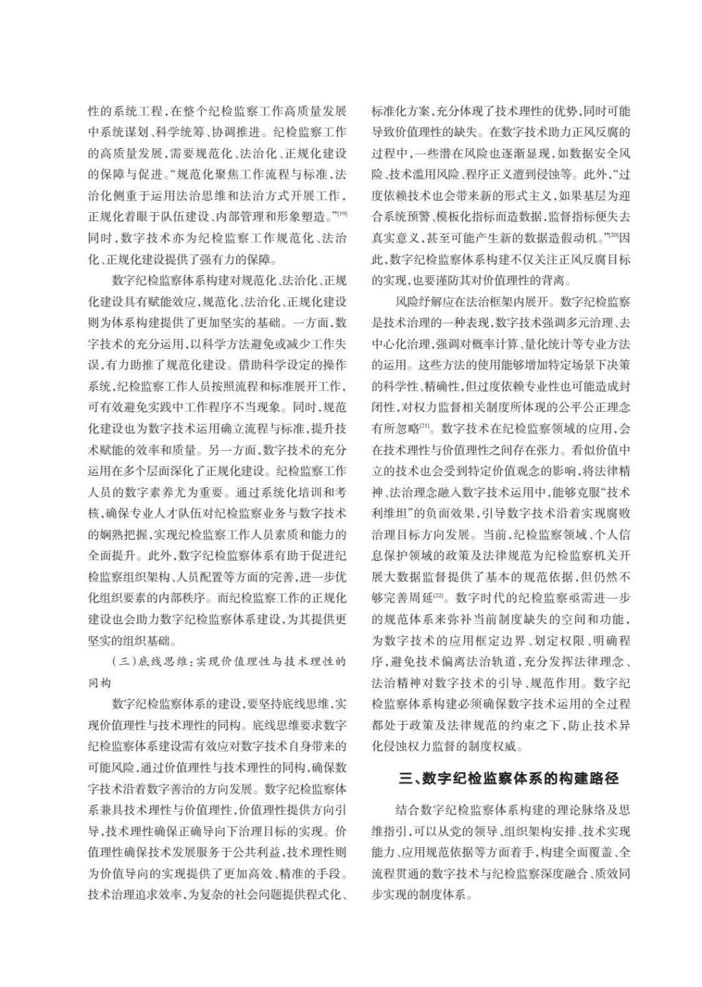 数字纪检监察是数字技术与纪检监察工作的深度融合,是贯通全流程、全要素的新型监督模式。文章创新性地提出以战略思维、系统思维、底线思维指引体系建设,强调实现价值理性与技术理性的同构。在构建路径上,主张建立“纵横结合”的组织体系,通过纪检监察一体化工作平台建设,破解“数据孤岛”问题。文中还特别关注了“算法黑箱”、数据安全等风险防范,提出以法治引领实现“数字善治”。该文通过对四川省成都市金牛区、浙江省绍兴市等地方实践的分析,为构建数字纪检监察体系提供了兼具理论深度与实践价值的参考,对推进纪检监察体制改革具有重要意义。