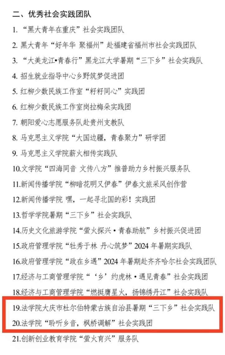 大学生志愿者暑期‘三下乡’社会实践优秀社会实践团队”荣誉称号。是肯定,亦是激励。下一步,实践团将继续以积极进取、昂扬向上的风貌参与社会实践,用行动助力龙江法治振兴!