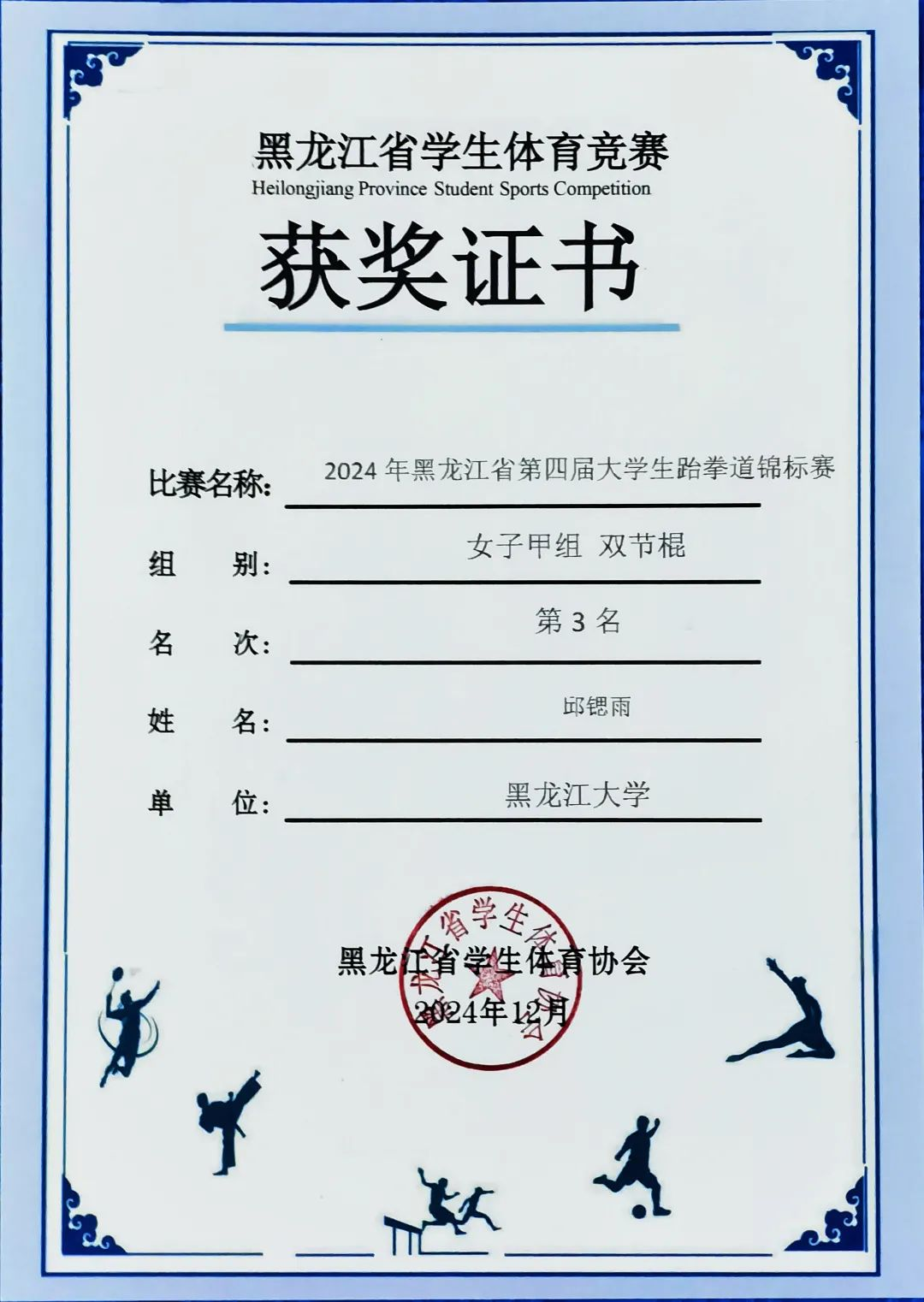 邱锶雨同学精神抖擞,斗志昂扬,游刃有余,无论是招式的流畅变换,还是迅速的转身踢腿,都凝聚着平时训练的汗水和心血,也是她对跆拳道这项运动热爱与坚持的最好证明。经过多轮比拼,她获得了黑龙江省大学生跆拳道锦标赛双截棍项目女子组季军,这是她继获得av麻豆