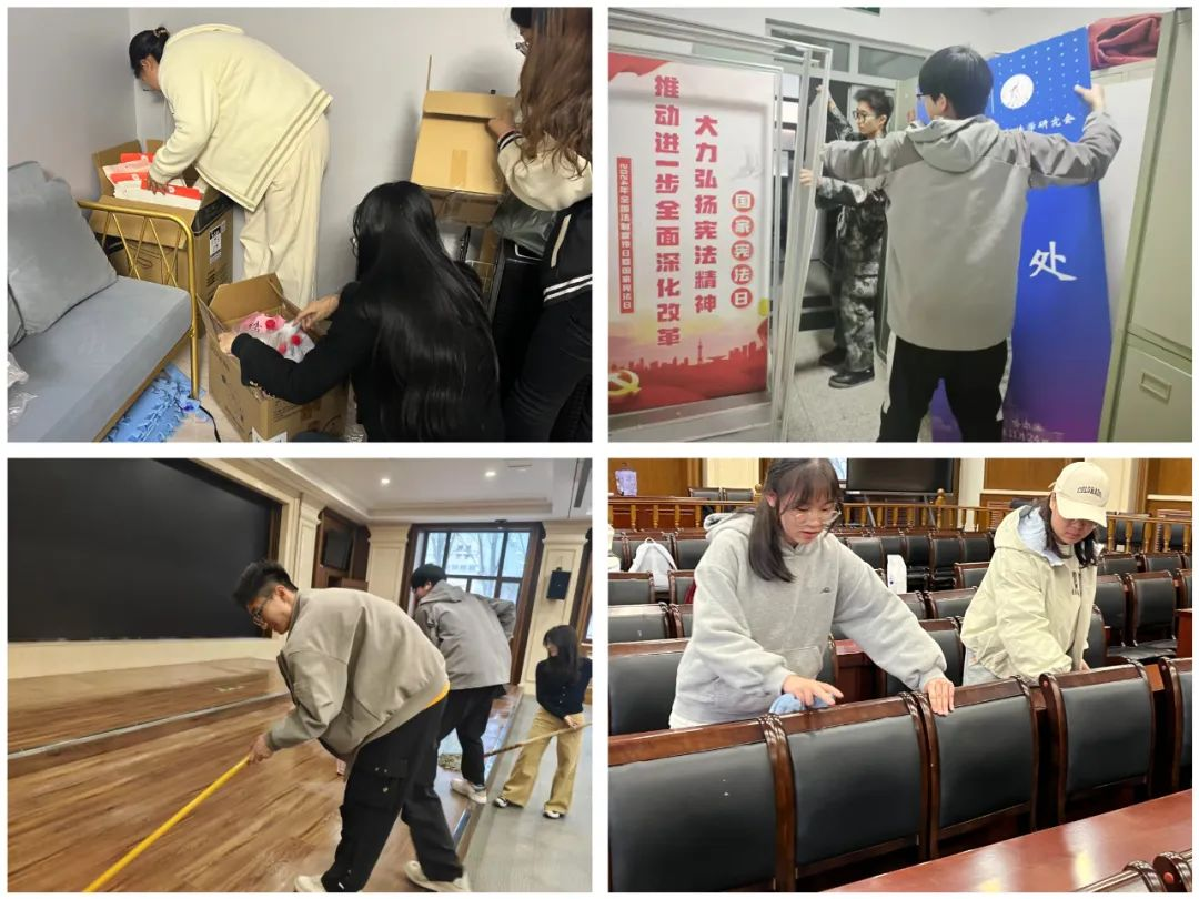 从擦拭窗台,到清扫地板,再到清理地面,志愿者们分工明确、配合默契,仔细检查每一个角落,对所负责的区域进行了彻底的清洁,经过大家的努力,学院办公区变得整洁美观,模拟法庭焕然一新;同时,志愿者们化身宣传员,深入学生中间,以倡议的形式宣传寝室环境整治的重要意义,引导同学们自觉参与到环境整治中来,发挥弘扬主人翁精神,时刻保持周边环境卫生整洁有序。