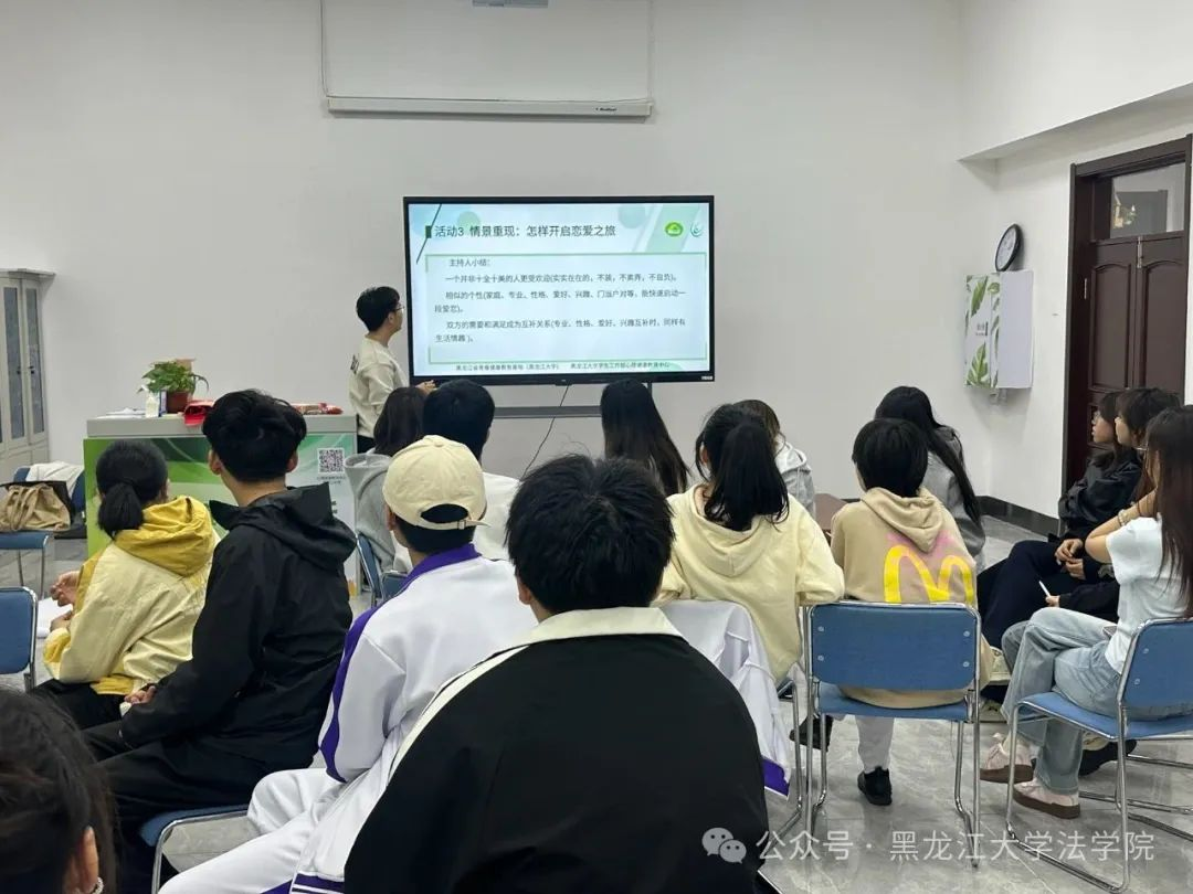 活动第三部分是由杨宇琦同学主持的情景模拟环节,主持人在屏幕上播放四个案例供参与者们选择,参与者分成两组分别选择一个案例进行现场演绎,代入案例中角色的视角,深入理解在恋爱过程中可能会产生的爱而不得、一味付出不求回报等心理问题和烦恼,通过对相关角色的演绎和主持人的引导,参与者们分享了自己的感悟,从中认识到正确的恋爱应当先学会自爱,注重平等沟通,保持清醒判断,理智看待爱情,从而进一步树立正确的恋爱观。