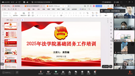团委组织开展“赓续红色血脉,青春挺膺担当”主题团课暨线上团务培训活动。本次活动由团委学生副书记、2023级7班团支书黄浩楠主持,各班级团支书积极参与。