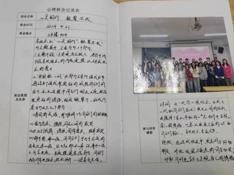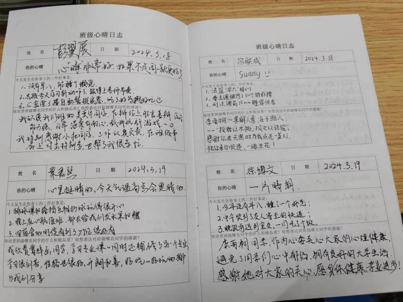 开展了班级心晴日志传递书写活动,同学们通过书写日志分享内心的喜怒哀乐,真情实感跃然纸上。不仅让同学们更深入了解彼此的内心世界,还增强了大家的情感表达和心理调适能力。同学们借此增进了理解与友谊,班级氛围更加积极健康,为大学生活增添温暖与力量。