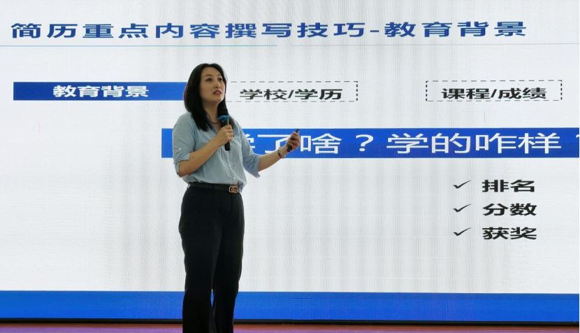 于大学生活动中心四楼招聘大厅承办毕业生就业“百日冲刺”行动系列专题讲座——“职场简历必修课”,特邀集团公司人资总监,龙江网才HR联盟益行社负责人,二级人力资源师,二级心理咨询师就业导师孟莹主讲,av麻豆