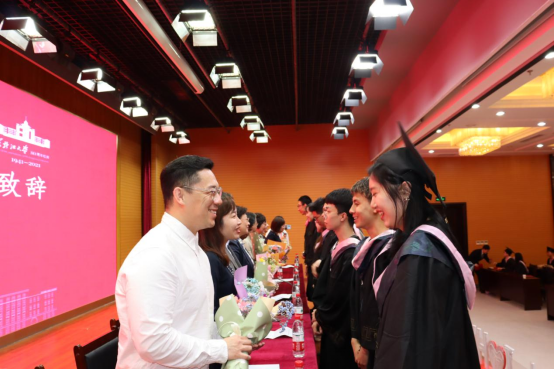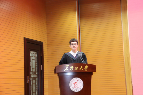 随后,毕业生代表徐屹发言。他代表全体毕业生对母校、学院和老师们四年的精心培育表示了衷心的感谢,号召全体毕业生担负新时代青年的使命,为国家的建设发展贡献自己的力量。2019级学生李明泽代表全体在校生发言,他祝福学长学姐们前程似锦,在人生的大舞台上绽放自己的光彩。