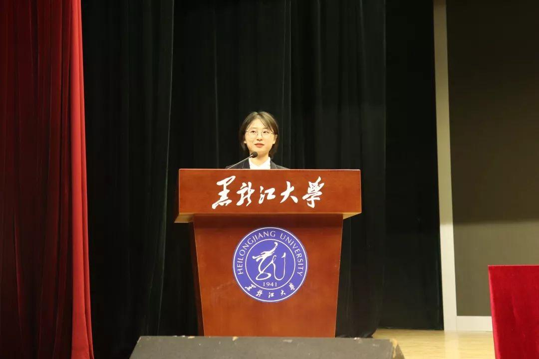新生代表2019级宪法与行政法博士研究生牛丹彤同学在发言中表示在崭新的学习生活中,会以博士研究生的身份重新启航,在研究中寻求真理,在追求中寻求进步,努力实现黑大梦,青年梦,中国梦。