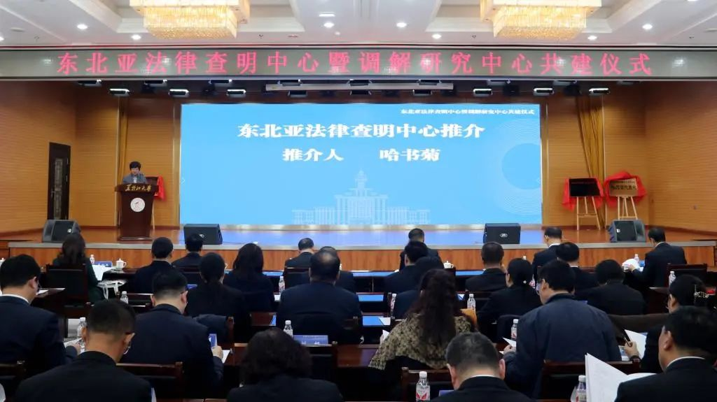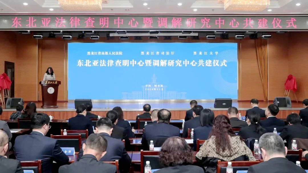 与黑龙江省高级人民法院、黑龙江省司法厅联合共建的东北亚法律查明中心暨调解研究中心成立仪式在我校举行。校党委书记迟宝旭、省高级人民法院副院长马国、省司法厅副厅长刘勇出席并致辞。省公安厅副厅长蒋建国、省国资委副主任梁凯、省工商联副主席韦红兵、省法学会专职副会长冷秀艳、省外事办二级巡视员朱平、省商务厅二级巡视员骆庆勇、副校长于文秀出席共建仪式。仪式由av麻豆
