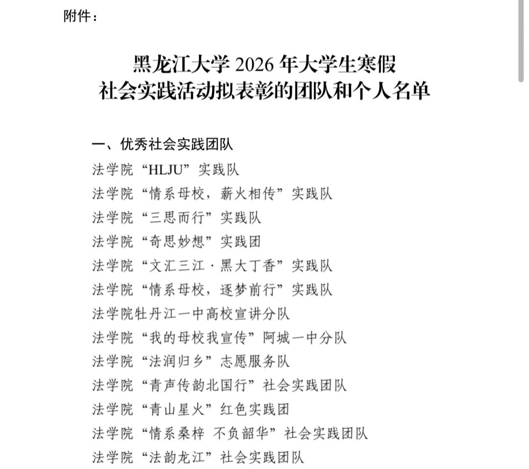 “HLJU”实践队、“情系母校,薪火相传”实践队、“三思而行”实践队、“奇思妙想”实践团、“文汇三江·黑大丁香”实践队、“情系母校,逐梦前行”实践队、牡丹江一中高校宣讲分队、“我的母校我宣传”阿城一中分队、“法润归乡”志愿服务队、“青声传韵北国行”社会实践团队、“青山星火”红色实践团、“情系桑梓 不负韶华”社会实践团队、“法韵龙江”社会实践团队共13个团队表现优异,荣获“av麻豆